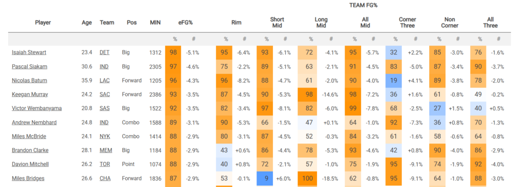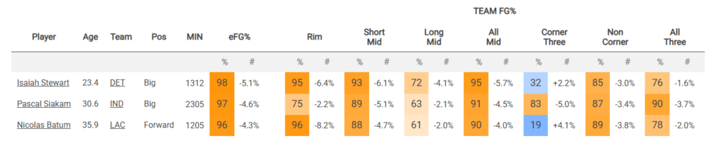 Isaiah Stewart est le joueur qui a le plus gros impact sur l’eFG% des adversaires quand il est sur le parquet. Il est 4ème en terme d’impact sur les tirs pris à l’arceau, 4ème sur les tirs pris à mi-distance, et 26ème sur les 3 points (9ème chez les « bigs »). Il n’y a que sur les tirs pris dans les corners qu’il n’est pas minimum 70ème centile (donc parmi les 30% meilleurs). Et si on regarde les tirs à 3 points au global, il est dans le meilleur quart de la ligue. J’ai joué un peu avec les filtres que proposent Cleaning The Glass, pour voir combien de joueur étaient dans le meilleur quart de la ligue, tous postes confondus toujours, en terme de baisse infligée à l’eFG%, à la réussite au cercle, à la réussite à mi-distance, et à la réussite à 3 points des adversaires. Voici la liste :