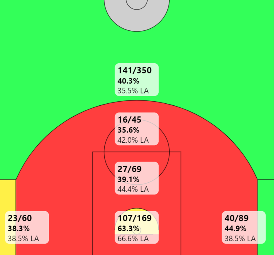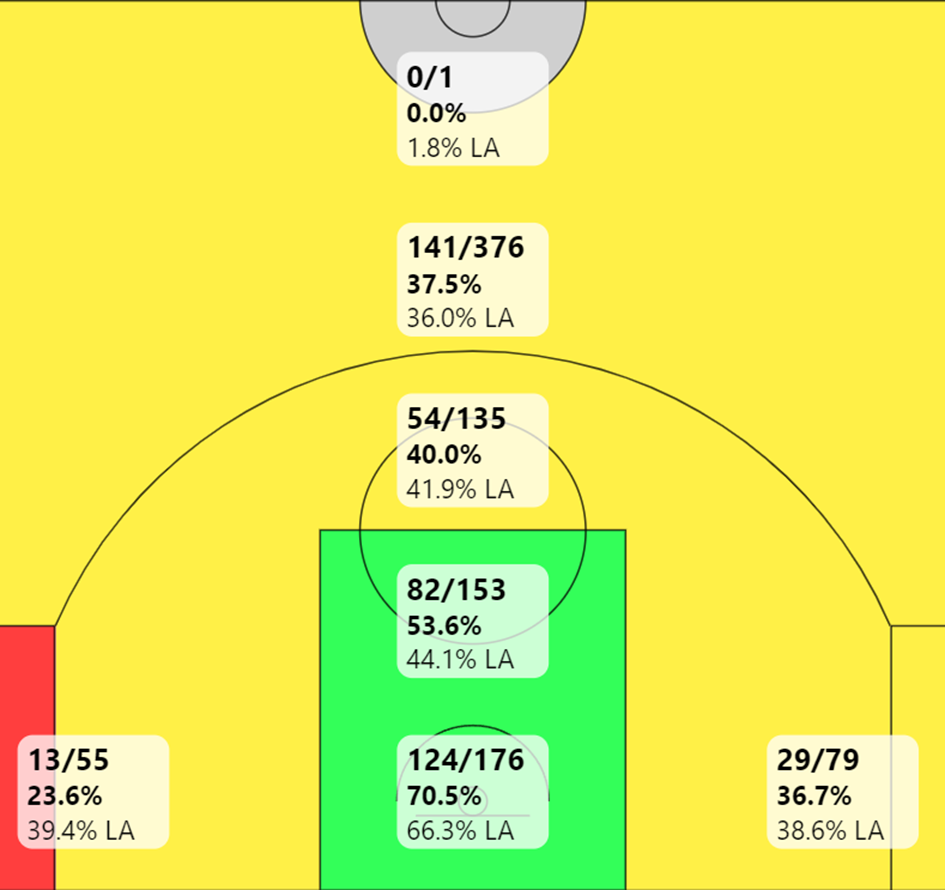 Observons la shoot chart de sa saison rookie. Il prend 30% de ses tirs à longue distance dans les corners, avec une majorité pour le corner gauche, puisqu’il est moins à l’aise à droite.