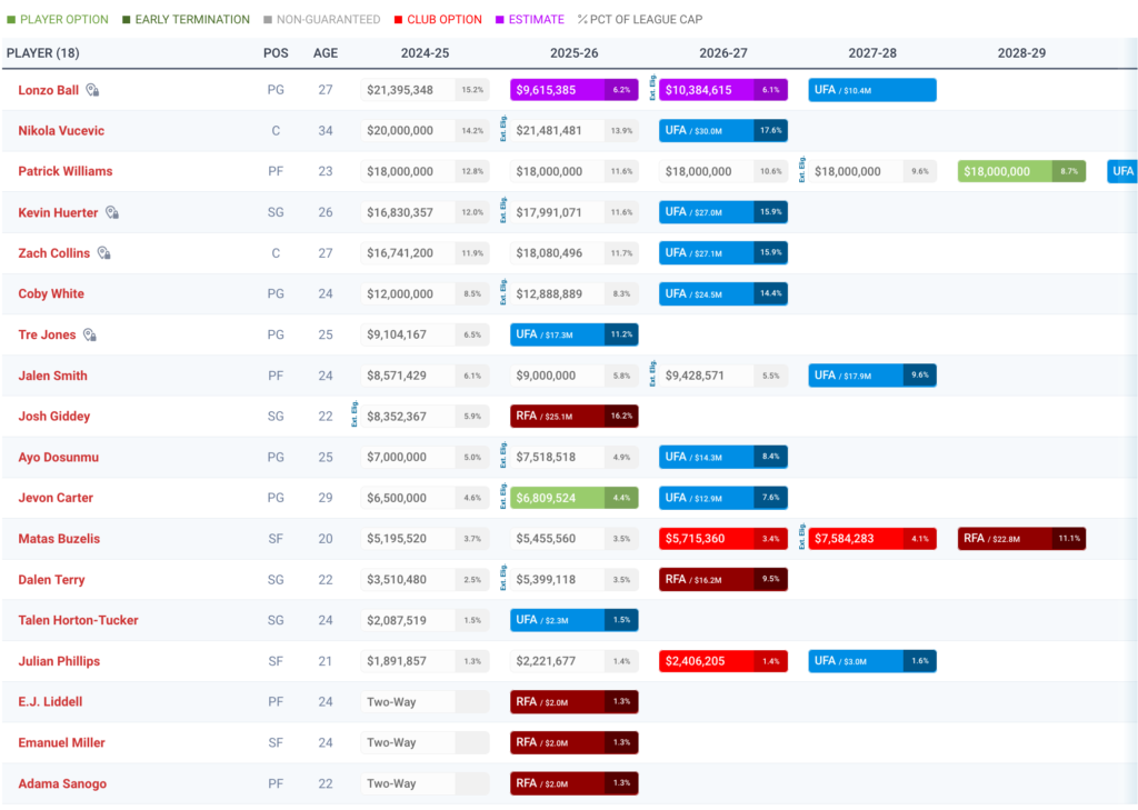 Vucevic sera en fin de contrat en 2026, mais ce n’est pas le seul : Kevin Huerter, Zach Collins et Jevon Carter (s’il active sa player option) le seront également. Lonzo Ball, qui a prolongé pour 20 millions de dollars sur deux ans, et Jalen Smith ont des deals allant jusqu’en 2027 tandis que Tre Jones est agent libre dans quelques mois à peine. Si les différents éléments mentionnés ne semblent pas destinés à avoir un rôle prépondérant pour le futur, d’autres joueurs de l’effectif vont nécessiter une réflexion.