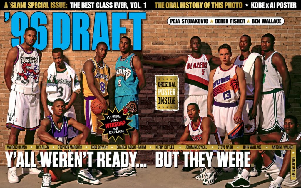 Le magazine avait pressenti que cette cuvée serait exceptionnelle, et l’histoire leur donnera raison : elle compte quatre Hall of Famers, Kobe Bryant, Allen Iverson, Steve Nash et Ray Allen, un total de 10 All-Star, 8 joueurs All-NBA, 3 MVP ainsi qu’un total de 21 titres de champion NBA remportés. Pourtant, presque aucun des rookies présents ne connaissait SLAM, et le shooting débute par une douche improvisée pour simuler la sueur. S’ensuit un casse-tête pour placer chacun devant un mur de briques extérieur, loin du confort des lumières artificielles des salles NBA ou des studios. « On ne voulait pas qu’ils soient éblouis par le soleil, ce n’était pas simple à exécuter », se souvient Nathaniel S. Butler, photographe de la séance.